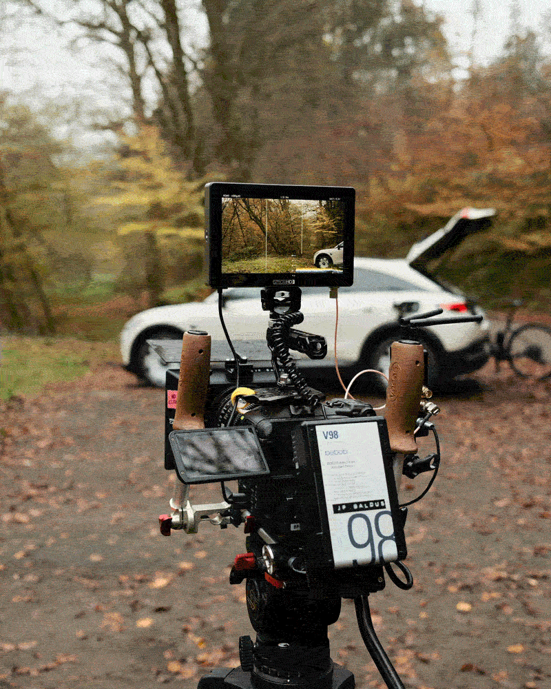 A professional camera on a tripod captures footage of an outdoor scene with a white SUV and a bicycle in front of trees with autumn foliage.